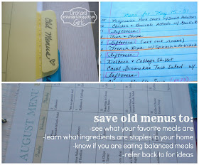 I like to keep my old menus for several different reasons. They help me learn things about what we eat. It helps me find some of our favorite recurring recipes. It also helps to have pre-made menus handy when I'm not feeling particularly inspired.